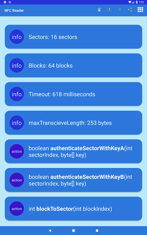 - Interfaccia visiva molto semplice. Elencherà solo tutte le informazioni istantanee ricevute dal tag NFC. Elencherà anche tutti i metodi disponibili.