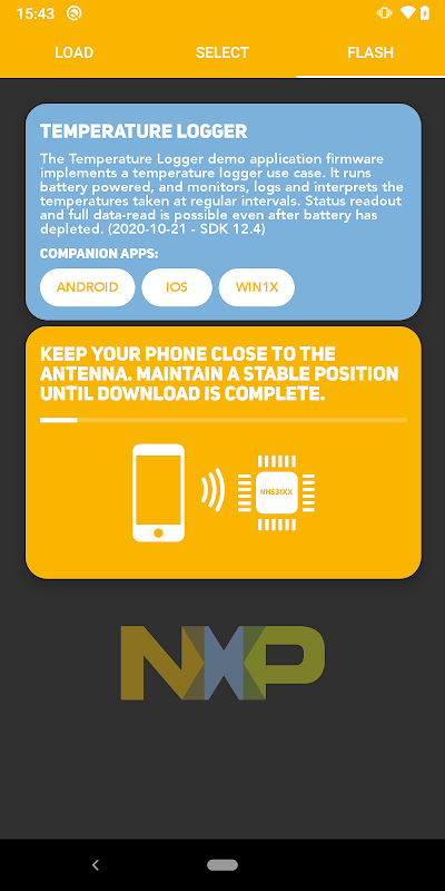 Puoi scegliere dall'elenco di demo fornite da NXP oppure puoi rendere disponibili le tue demo nell'app. L'immagine del firmware selezionata verrà inviata tramite l'interfaccia NFC all'IC NHS31xx. Al termine del download, il bootloader di seconda fase non è più disponibile: l'IC viene resettato e la nuova applicazione viene eseguita.
