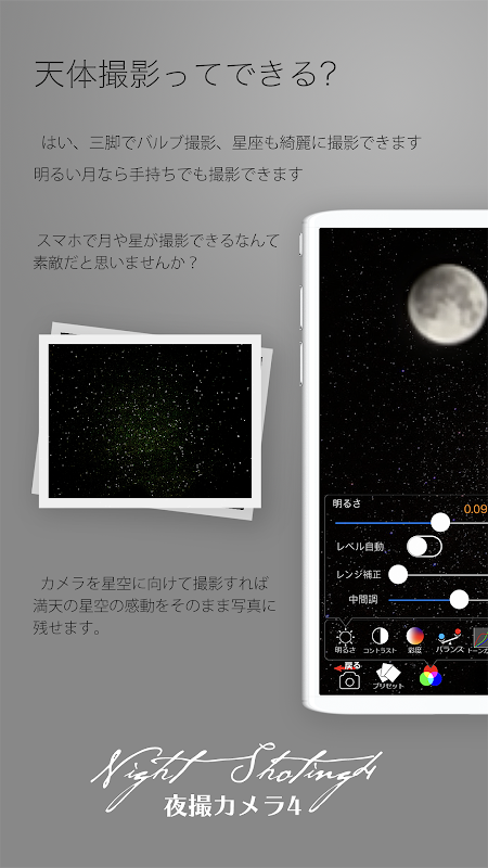 È l'applicazione fotocamera più adatta per riprendere scene notturne e scattare foto di cieli notturni.