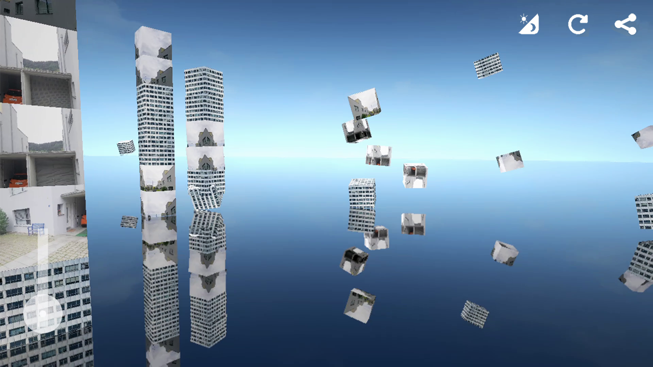 Quando voli attraverso la città, proietti singole immagini sui grattacieli, che vengono catturate automaticamente con la fotocamera dall'ambiente circostante.