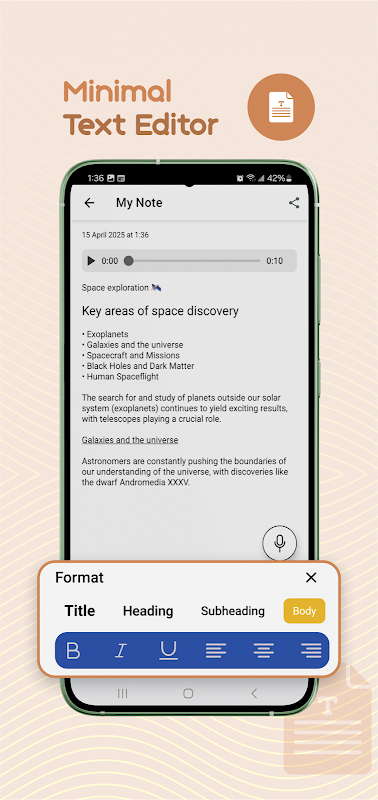 Notely Voice è l'app completa per registrare, trascrivere e organizzare le tue note vocali, completamente a mani libere. Che tu stia facendo brainstorming, scrivendo un diario, lavorando o studiando, Notely Voice trasforma i tuoi pensieri in note strutturate e modificabili all'istante.
