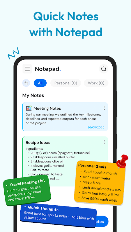 Blocco note - Elenco attività e note è l'app di produttività definitiva, progettata per semplificare il modo in cui crei, organizzi e gestisci idee, attività e promemoria. Che tu voglia scrivere appunti rapidi, creare una checklist dettagliata o pianificare la tua giornata con una lista di cose da fare chiara, questa app per blocco note ti offre tutto in un unico posto. Con potenti opzioni di personalizzazione, note colorate, promemoria, backup e widget, diventa il tuo compagno quotidiano per organizzare la vita.