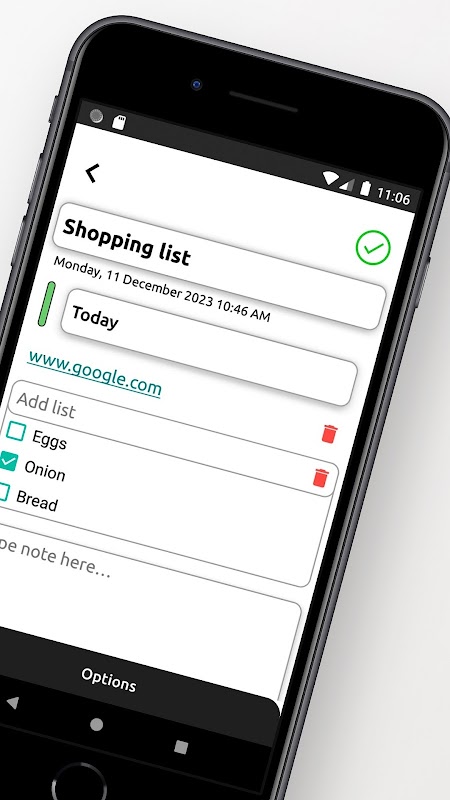 - Personalizzazione delle note: In ogni nota puoi aggiungere un titolo, un sottotitolo, una lista con i controlli e una nota dettagliata. Inoltre, puoi personalizzare le tue note con colori, immagini e collegamenti web utilizzando il pulsante "Opzioni".