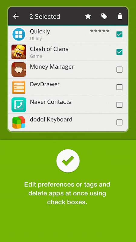 Ora avviare rapidamente tutte le applicazioni installate del telefono in modo rapido con i collegamenti preferiti app sulla barra di notifica e gestire tutte le applicazioni in modo semplice utilizzando i tag, le preferenze ei dettagli informativi app.