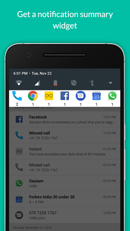 Notification Hub is an inbox your notifications. It is a smart manager, for all your apps notifications prioritised in a single place. You can also keep Android's Notification Drawer clean by hiding notifications for select apps. Also, get a notification summary widget.
