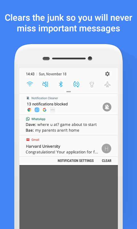 Basato su Intelligenza Artificiale, Notification Cleaner bloccherà automaticamente le notifiche di spam e pubblicità, permettendoti di ricevere solo notifiche importanti e rilevanti, senza lunghe configurazioni né la necessità di impostare un elenco di blocco o una lista bianca.