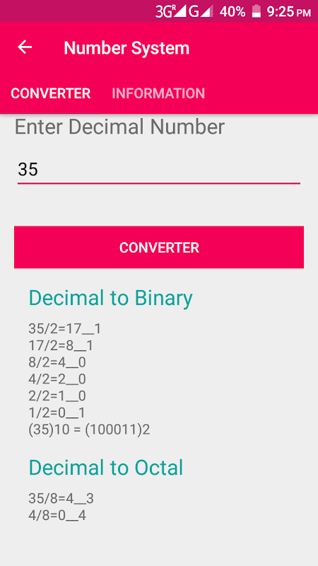 Pertanto lo studio dei numeri digitali e la sua conversione e operazione aritmetica diventa molto importante capire i concetti di base associati. Per rendere più semplice da capire i concetti di base, questa conversione numeri digitali android app sviluppata per eseguire l'operazione di conversione rapida tra decimale, binario, esadecimale e numeri ottali.