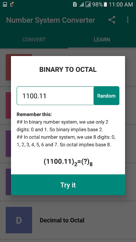 Sistema numerico: impara e converti con dettagli è la migliore app per ragazzi di ingegneria, informatica e IT. In questa app, puoi facilmente convertire un numero intero o frazionario nel sistema binario, decimale, ottale o esadecimale. Non è solo uno strumento educativo, è anche una calcolatrice e uno strumento di conversione.