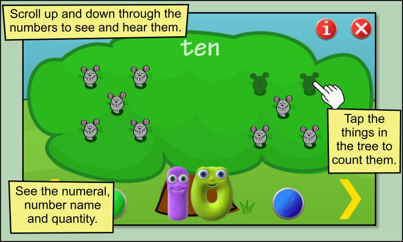 Children love to copy and count along, so the main activities each have a level where the numbers are spoken as items are counted, helping children become familiar with the number names and their order.