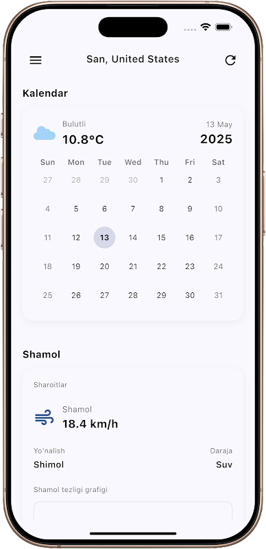 • Oddiy kalendardan sanani tanlang va o'sha kungi ob-havoni to'liq ko'ring.