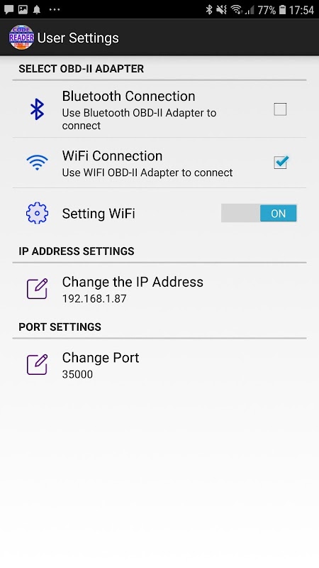 Utilizzare il menu "Impostazioni" per passare alla voce "Connessione WiFi". Quindi modificare l'indirizzo IP e la porta in base all'indirizzo IP e alla porta dell'adattatore. Fare clic due volte su "Connessione WiFi" per abilitare le voci "Impostazioni indirizzo IP" e "Impostazioni porta"