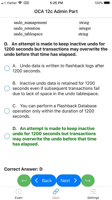 These are questions in OCA Oracle 12c DBA exam (1z0-062). We sure you will pass the 1z0-062 if you practice with this app. Many people passed this exam with 100% questions in this app. You only remember the answers in this app and you don't need to remember hundreds questions in dump :)