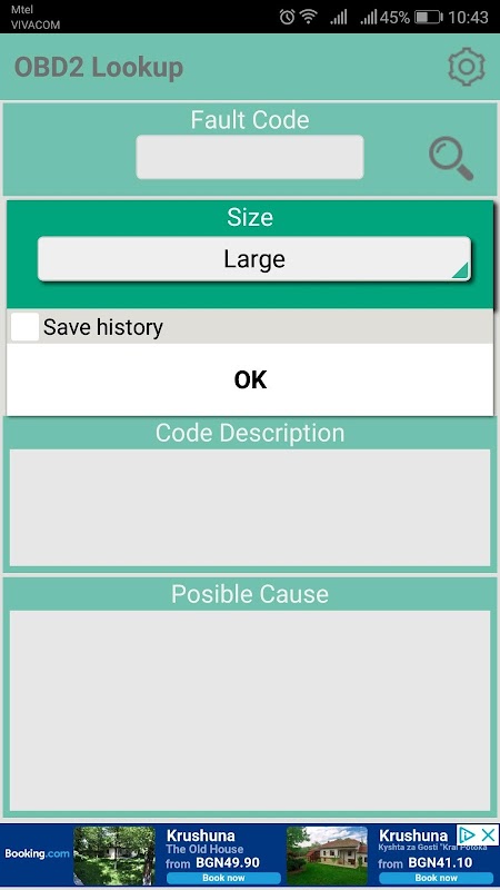 The app maintains a search history.