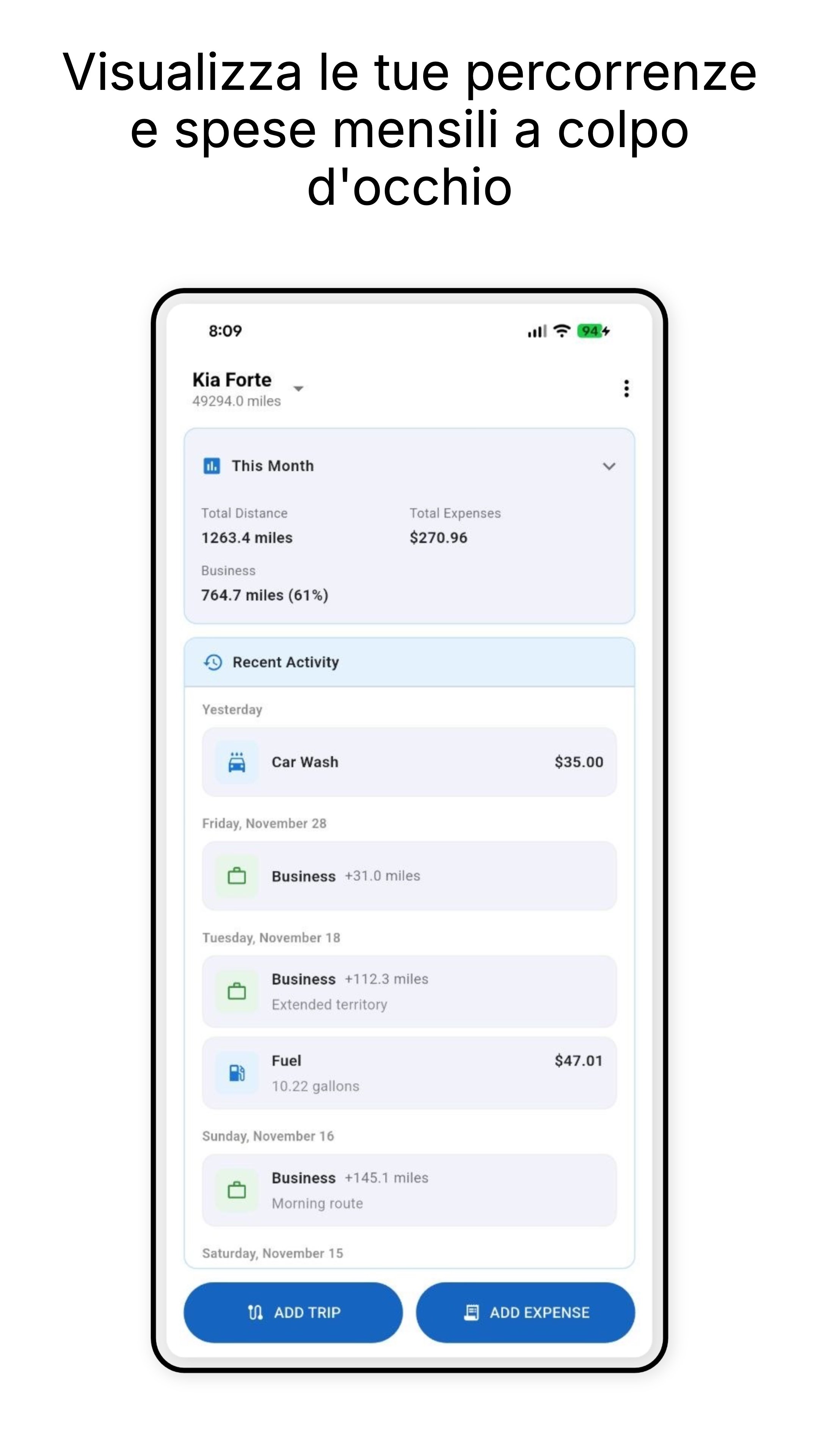 Visualizza a colpo d'occhio i chilometri totali, la suddivisione lavoro/personale e le spese.