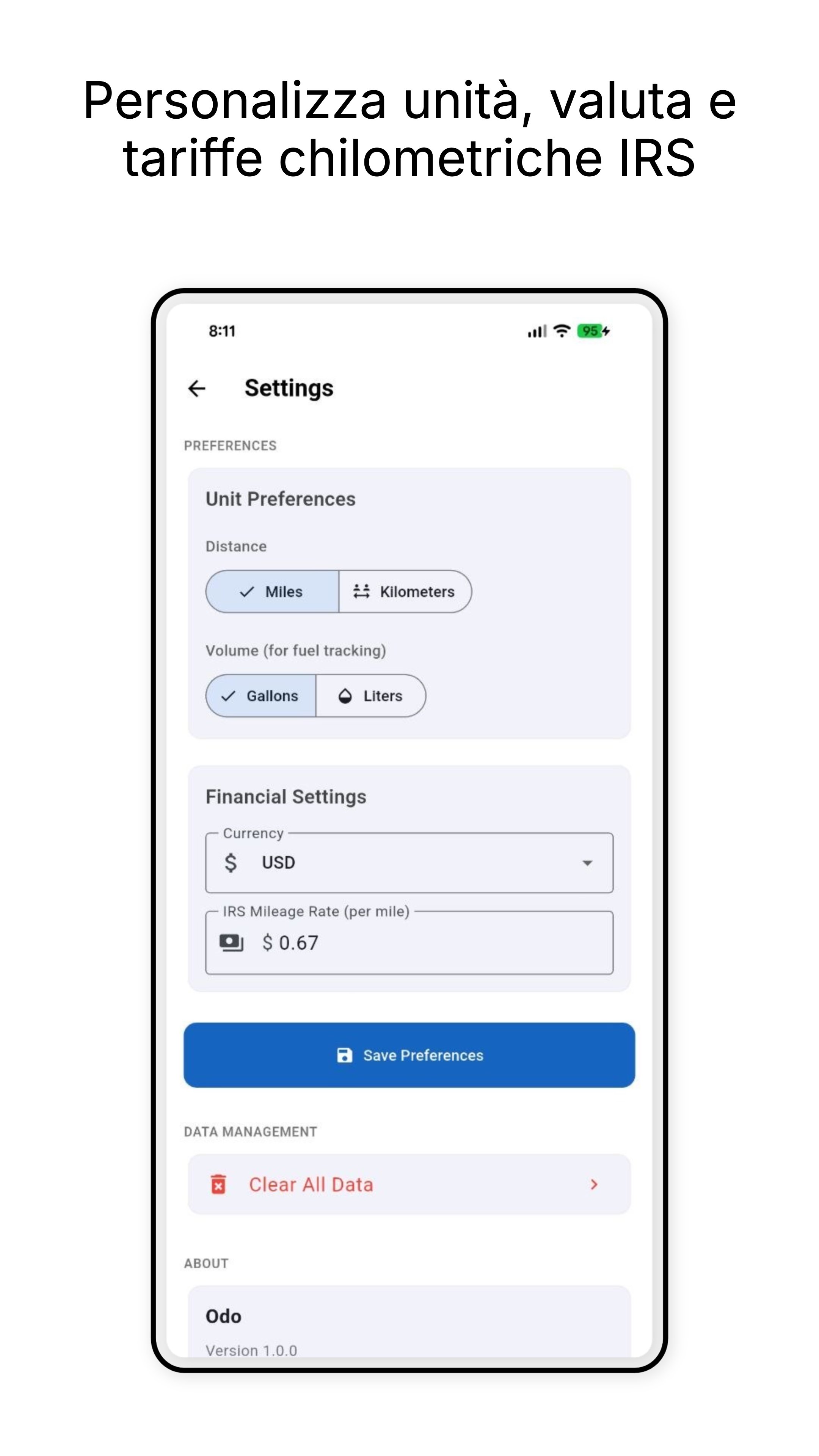 Inserisci le letture del contachilometri iniziale e finale. Odo calcola automaticamente la distanza. Segna i viaggi come lavoro o personali con un tocco.