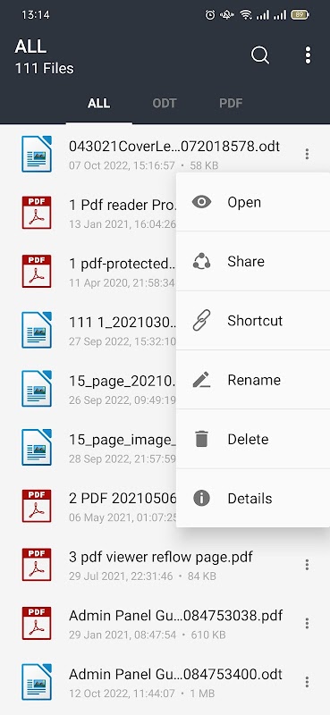 ► Elimina/Rinomina/Scorciatoia: puoi rinominare, eliminare, creare collegamenti e visualizzare i dettagli dei tuoi file ODT e PDF facilmente con semplici operazioni.