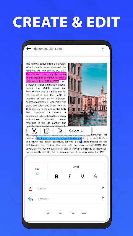 Editor di testo per documenti per telefoni e tablet, crea nuovi documenti o modificali con Office Reader - App di lettura Docx.