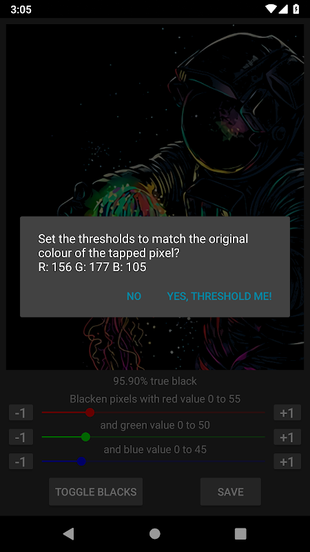 La conversione è regolabile semplicemente toccando l'immagine per scegliere un pixel di soglia o utilizzando tre cursori per controllare la soglia per i valori Rosso, Verde e Blu che verranno rilasciati a 0 e verrà mostrata un'anteprima prima di scegliere di salvare .