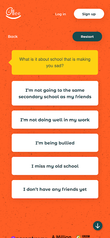 Utilizzando l'app, i bambini possono scegliere un argomento di cui vogliono parlare, quindi scegliere un'emozione che stanno provando. Potrebbe essere preoccupato, stressato, felice, confuso o un'altra emozione. Con suggerimenti come "Mi sento solo", "nessuno mi ascolta" o "Sto crescendo", Ollee offre ai bambini consigli di supporto su questo argomento e su come si sentono.