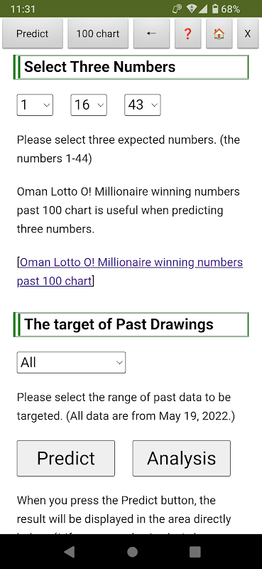 Questo software non è un software di previsione perfetto perché devi pronosticare tu stesso i tre numeri utilizzando la tabella "Oman Lotto O! Numeri vincenti del milionario oltre i 100".