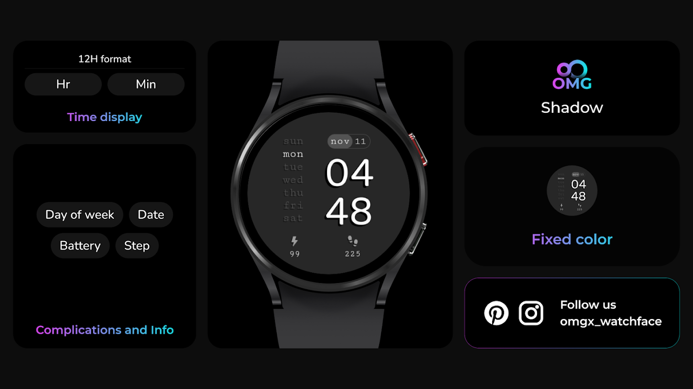 Aggiorna il tuo smartwatch con OMG Shadow. Progettato per la semplicità, questo quadrante minimale offre un perfetto equilibrio tra stile e funzionalità essenziale.