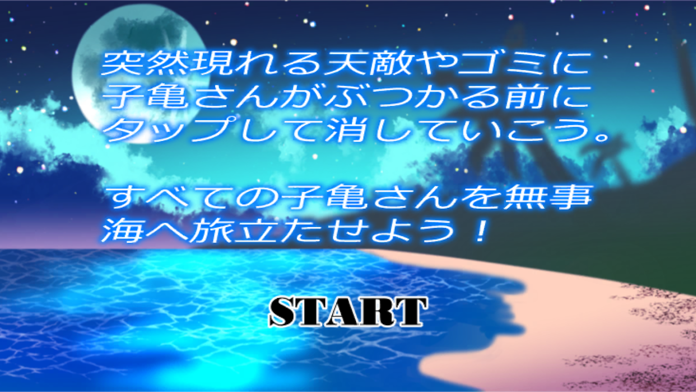 Un semplice gioco in cui il giocatore prende un gran numero di tartarughe marine schiuse (nate), elimina i nemici naturali e la spazzatura e manda in mare quante più tartarughe possibili!