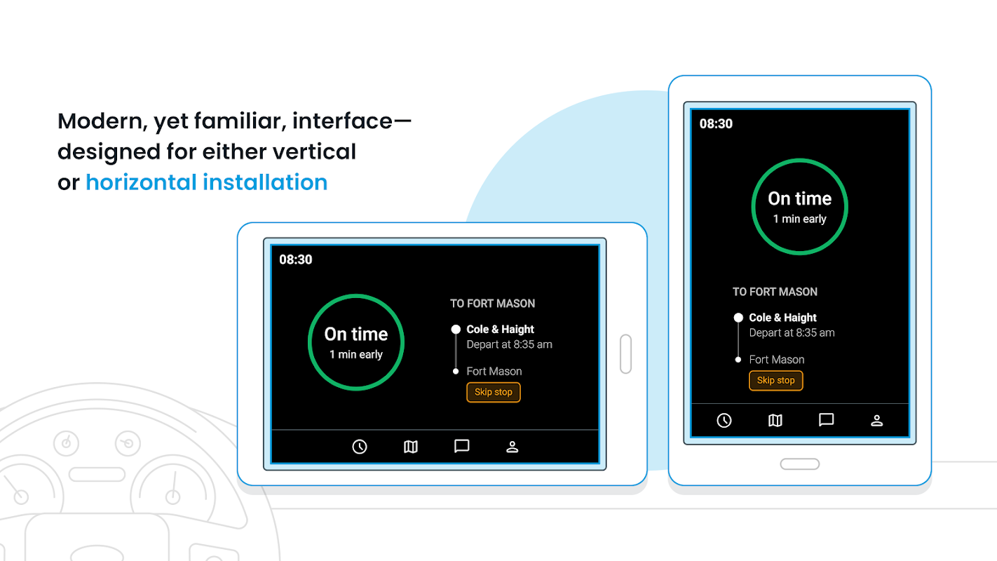 L'app di bordo di Swiftly è un'applicazione semplice e sicura rivolta all'operatore che fornisce assistenza alla navigazione e feedback sulle prestazioni in tempo reale direttamente agli operatori dei veicoli di trasporto pubblico.