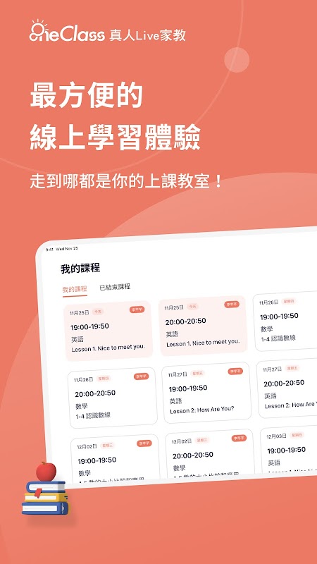 無論何時何處,一機在手即可進入線上教室,師生一對一專屬課程,開始 OneClass 的線上學習,完整課堂互動功能,如同面對面教學。