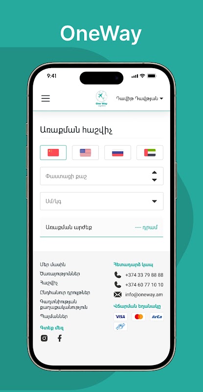 OneWay è un ponte tra i consumatori in Armenia e i negozi online negli Stati Uniti, Cina, Spagna, Lussemburgo e Russia. I vantaggi dell'acquisto tramite OneWay sono prezzi più bassi, consegna rapida e sicura e commissione dello 0%.