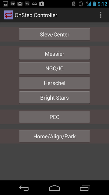 OnStep is a DIY computerized GoTo controller for Telescope mounts. This App controls most functions through Bluetooth from your Android cell phone or tablet. The user can align the mount, park/un-park, program PEC, and find and go to objects from several catalogs. Including: NGC, Hersclel 400, and Messier catalogs along with an catalog of bright stars.