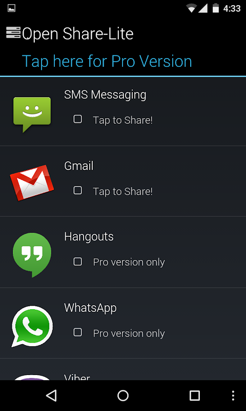 Open Share Lite allows you to share a post to multiple social networks at the same time. Open Share Lite allows multiple sharing with Tumblr, Google+, SMS Messaging, Gmail, and Viber. To share on more Social Networks like Twitter, Facebook Messenger, LinkedIn, Google Hangouts, and WhatsApp, you can upgrade to the Full Version for only €0.99.