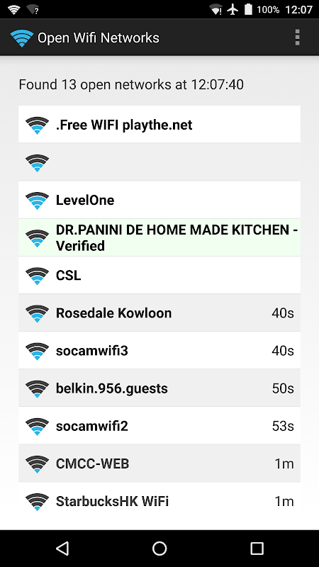 The "Open Wifi Finder" is a simple activity that displays open wifi networks that your device can connect to. It is a copy of the android wifi network connection dialog with several differences. It displays only open networks which is useful when you need free internet connectivity while on the go. Sometimes networks that haven't broadcasted recently disappear and reappear. Sometimes there are a zillion networks in the wifi connect list. Finding and connecting to an open network in a highly fluid and huge list makes connection difficult. This activity attempts to keep the list small and more manageable. There are usually a lot of open networks that are not open and require a username and password. This activity allows you to blacklist networks that you never want to connect to. This activity is useful when all you want to is open wifi networks quickly and efficiently.