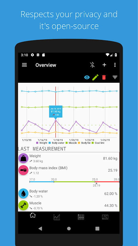 Monitor and track your weight, BMI, body fat, body water, muscle and other body metrics in an open source app that: