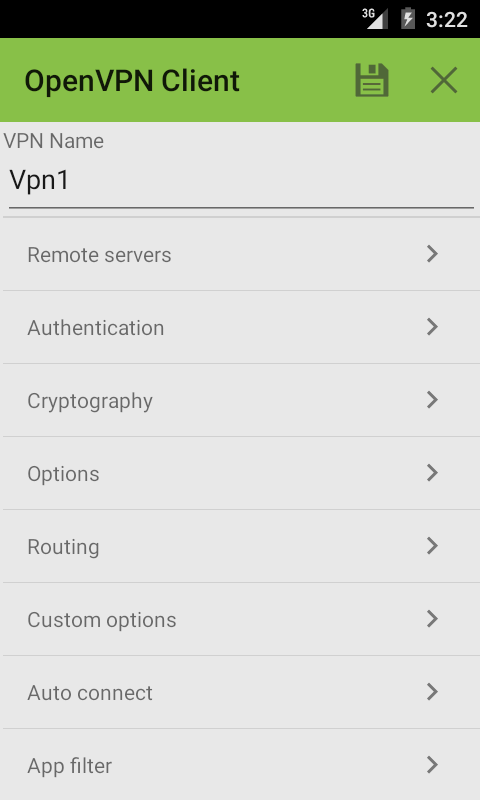 * To import a openvpn configuration file, copy the ovpn file on the device memory and put in the same folder any external certificates/keys files. Then start the app, tap on "+" button in bottom right corner and choose "Import VPN profile". After the import, the files can be deleted.