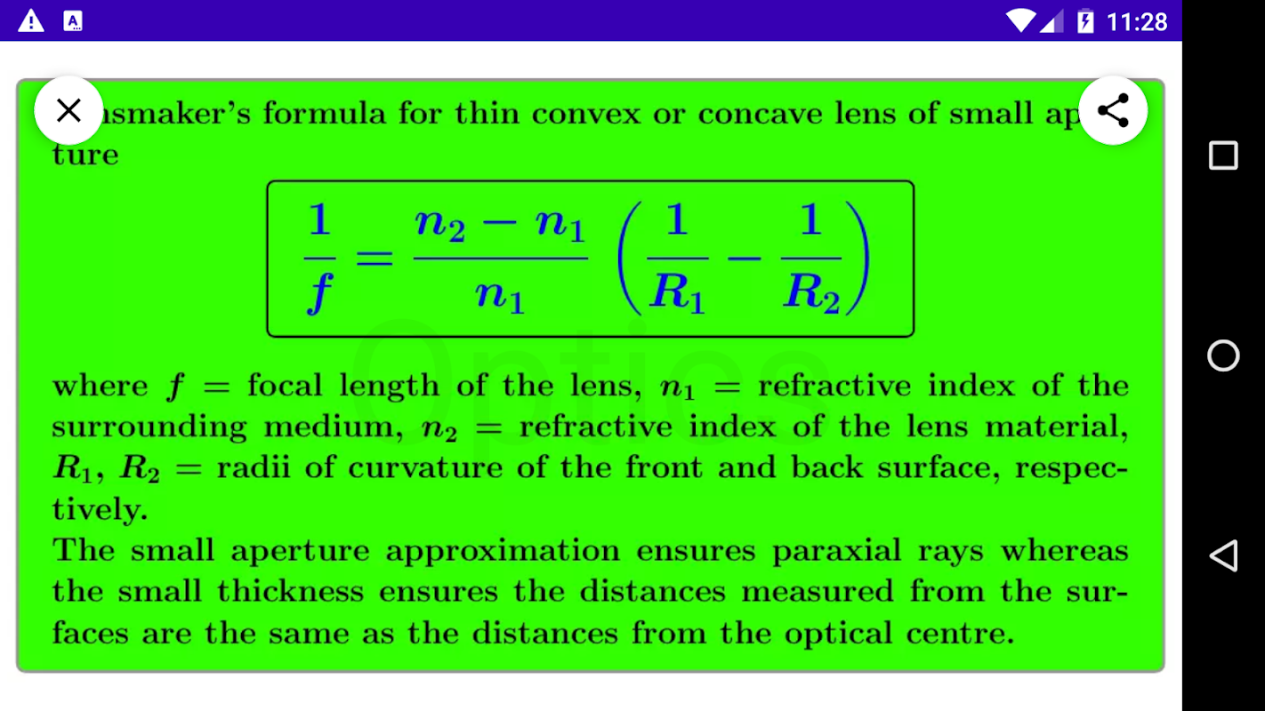 Optics è un'app gratuita per studenti universitari per imparare la fisica ottica da una rappresentazione concisa di ogni argomento e praticare la materia e valutare la preparazione attraverso test e quiz MCQ.