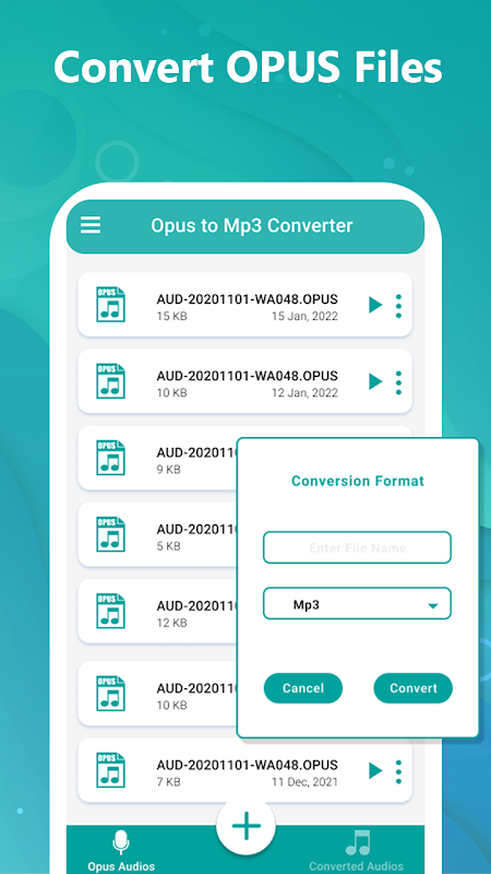 Opus / converter to mp3 app allows the user to convert the Opus files into Mp3 so that the user can play it whenever they want and share it with their friends and family. There are two main features of the opus converter to mp3 app; opus audios and converted audios. The opus to mp3 converter / mp3 converter offline app will automatically look for voice messages or opus files in your device, which can be later played using the opus to mp3 converter no ads / mp3 converter music. The opu / opus to mp3 converter free app permits the user to convert the file in MP3, AAC, OGG, WAV, or M4A format as per their requirement. The user can easily choose any format and download the file using the opus to mp3 convertor / mp3 converter offline app. In addition, the user can also search for any opus file using the search bar at the top of opus to mp4 converter. Finally, the user can determine the title, date of creation, and size of that particular file using this app.