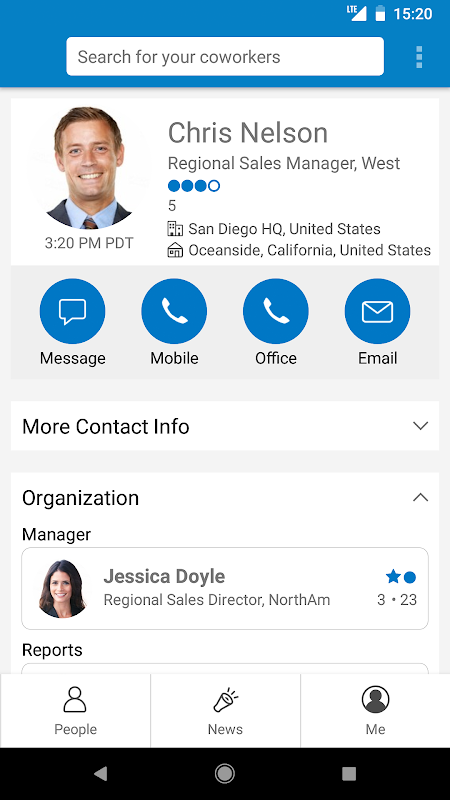 - Trova colleghi e raggiungili rapidamente tramite telefono, SMS, e-mail e chat.