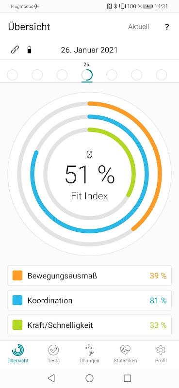 Knee - App leitet Sie zu den verschiedenen Bewegungsübungen und -tests an. Der dazugehörige Sensor erfasst Bewegungsparameter, die App analysiert diese, wertet sie aus und gibt Ihnen anschließend direkt Feedback. Diese Analysen und Auswertungen geben Rückschlüsse zu Ihrem individuellen Heilungsverlauf. Zur Evaluation werden die Messergebnisse der verletzten Seite mit der Gegenseite verglichen – dieser Wert wird Ihnen in der App als Fit-Index dargestellt und kann mit weiteren Angaben in der Verlaufsanalyse den Therapieverlauf klarer und objektiver darstellen. International wird hier vom Limb Symetrie Index (LSI) gesprochen. Der Fit-Index bzw. LSI kann auch noch in Unterkategorien weiter analalysiert werden, welche dann in unterschiedlichen Farben pro Kategorie dargestellt werden. Das integrierte Rehabilitations- und Übungsprogramm unterstützt Sie, sich insgesamt und speziell in einzelnen Bewegungskategorien