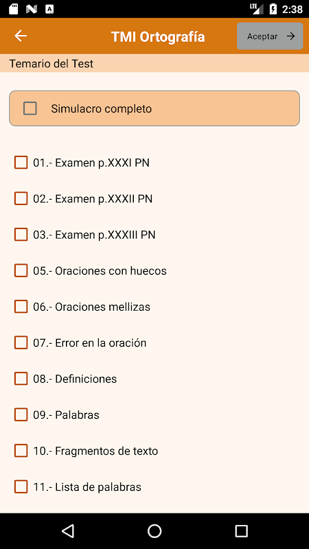 Ha anche i test di ortografia delle opposizioni di XXXI, XXXII, XXXIII, XXXIV e XXXV promozione della scala di base della polizia nazionale, come esempio di come sono gli esami ufficiali in questi esami.