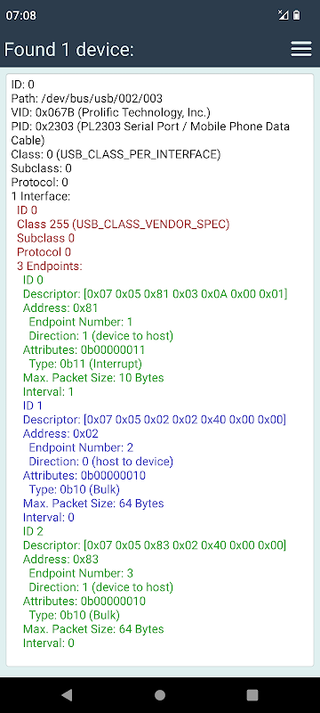 Mostra dettagli del dispositivo USB come VID, PID, Class, interfacce, tipi di endpoint.