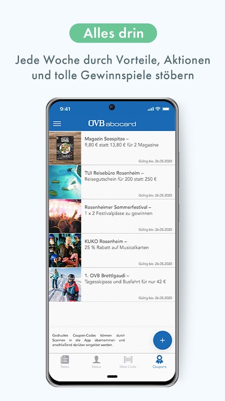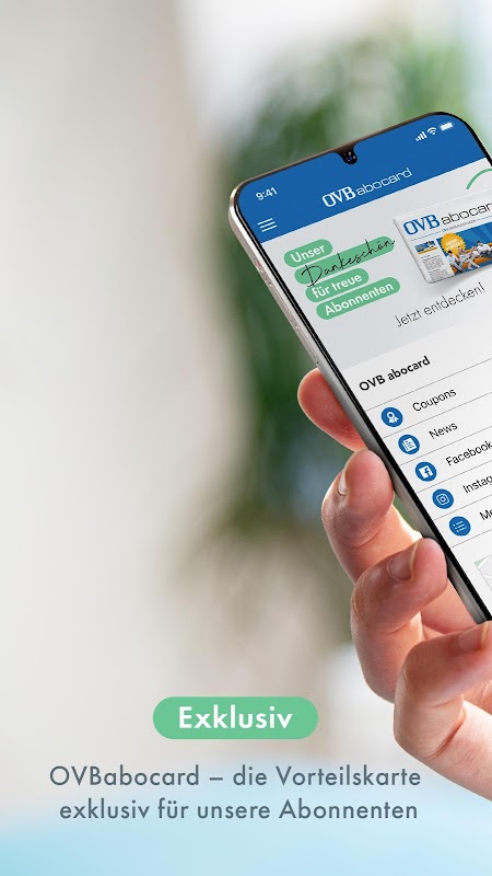 Con l'app gratuita "OVB abocard", hai sempre a portata di mano la tua carta cliente OVB in forma digitale, portando il colorato mondo dei vantaggi direttamente sul tuo smartphone. Che si tratti di sconti e promozioni interessanti presso i fornitori regionali, grandi competizioni o accesso a eventi esclusivi, i vantaggi cambiano regolarmente e grazie alle notifiche push sei sempre aggiornato quando ti aspettano nuove cose. Ulteriori informazioni e condizioni di partecipazione sono disponibili all'indirizzo www.ovberleben.de/abocard. Lo sapevi: puoi anche utilizzare la OVB Abocard presso tutti i partner + Punktcard e quindi ottenere ulteriori vantaggi.