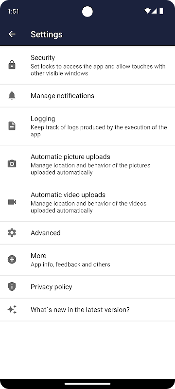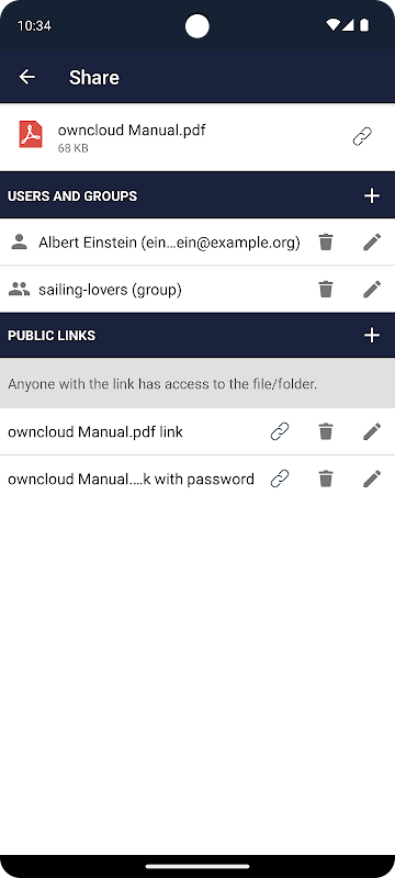 Con l'app Android ownCloud puoi sfogliare tutti i tuoi file sincronizzati con ownCloud, creare e modificare nuovi file, condividere questi file e cartelle con i colleghi e mantenere sincronizzati i contenuti di quelle cartelle su tutti i tuoi dispositivi. Copia semplicemente un file in una directory sul tuo server e ownCloud fa il resto.