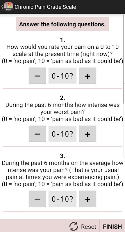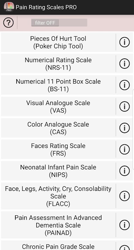Questa applicazione fornisce alcune delle scale di valutazione e valutazione del dolore più utilizzate, validate e ampiamente accettate. In primo piano ci sono le scale di auto-segnalazione e di osservazione per la valutazione del dolore in neonati, bambini, adulti, persone demente, pazienti in terapia intensiva e persone che soffrono di dolore cronico o lombare: