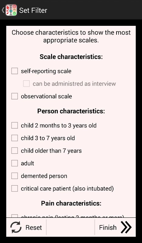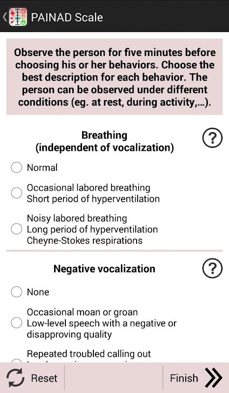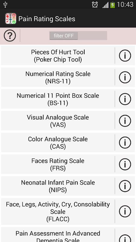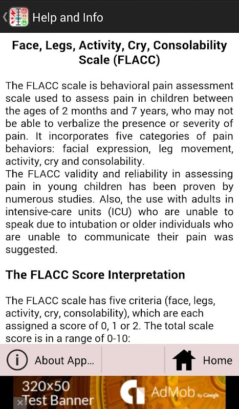 Questa applicazione fornisce alcune delle valutazione del dolore e di rating scale più utilizzati, convalidati e ampiamente accettati. In primo piano sono self-reporting e scale di osservazione per la valutazione del dolore in neonati, bambini, adulti, persone dementi, pazienti in terapia intensiva e le persone che hanno dolore cronico o di schiena: