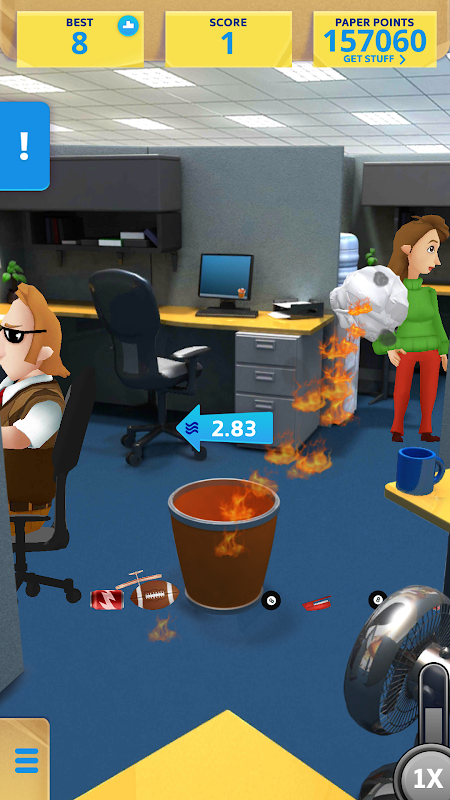 Ti ricordi quei fastidiosi colleghi del: “Ehi, mi hai colpito!” nel Paper Toss originale? Beh ora puoi lanciar roba direttamente contro di loro! (Se ti senti in vena di cattiverie.) Continuerai ad accumulare punti per ogni palla di carta che centra il cestino dell’ufficio, ora dal design super ergonomico! Inoltre, potrai mettere alla prova le tue abilità con palle di carta in fiamme, banane, pomodori, granate e altra roba divertente che potrai lanciare nella classica ambientazione da ufficio e molto altro. Che aspetti?! Comincia a lanciare!