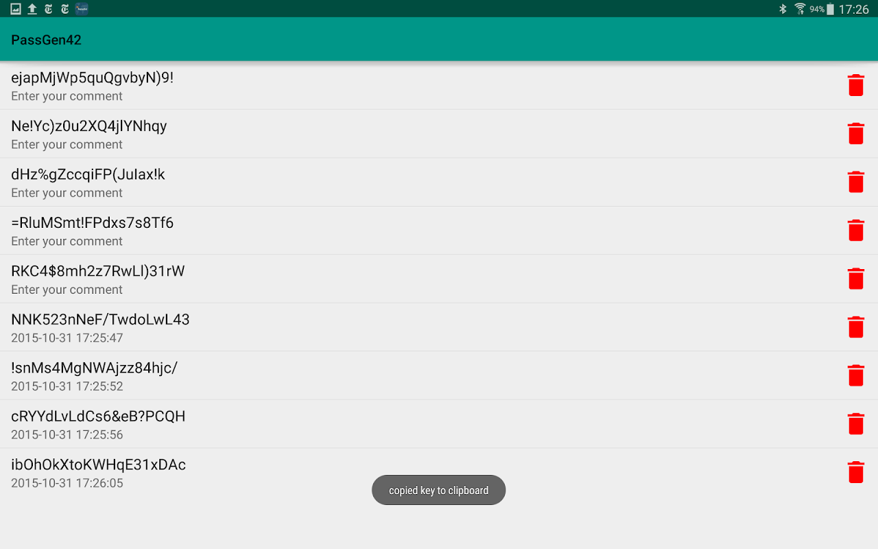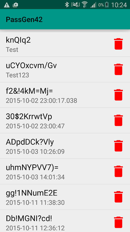 Random Password Generator with Widget PassGen42 allows you to create random Passwords with Predefined and your own Charset. By Pressing on your Entry´s you can edit them or share them through the most Apps on your Phone.