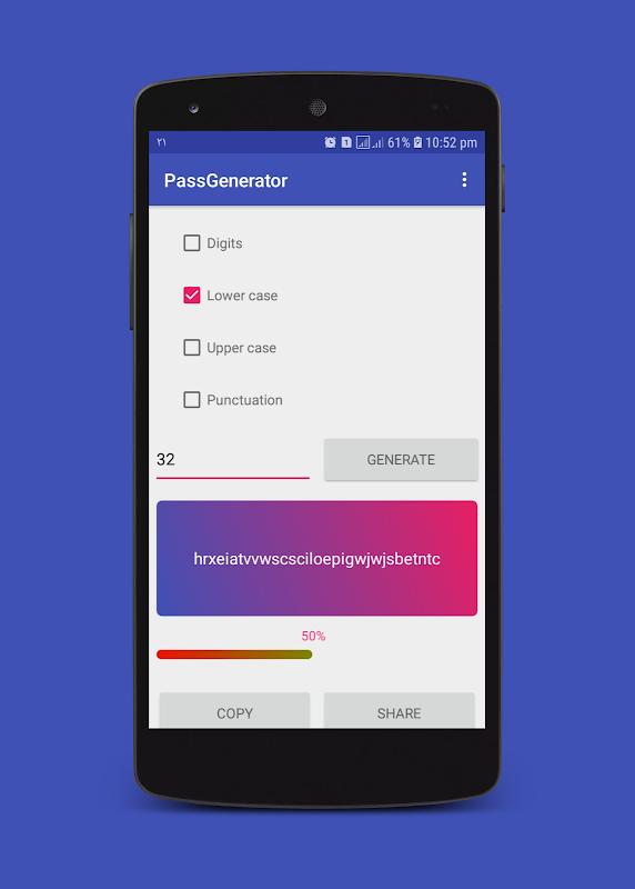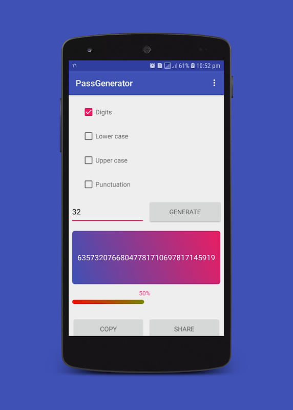 You may not believe it, but it takes a long time to hack this password, so make strong passwords for your accounts, this app will help you to create passwords including numbers, lowercase letters, uppercase letters, and symbols.