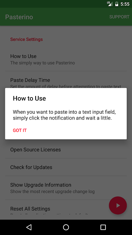 Pasterino requires an Accessibility service to assist users with disabilities by allowing them to easily paste content into input fields. Pasterino does this by searching through the current open screen and pasting clipboard content into the currently focused input field.