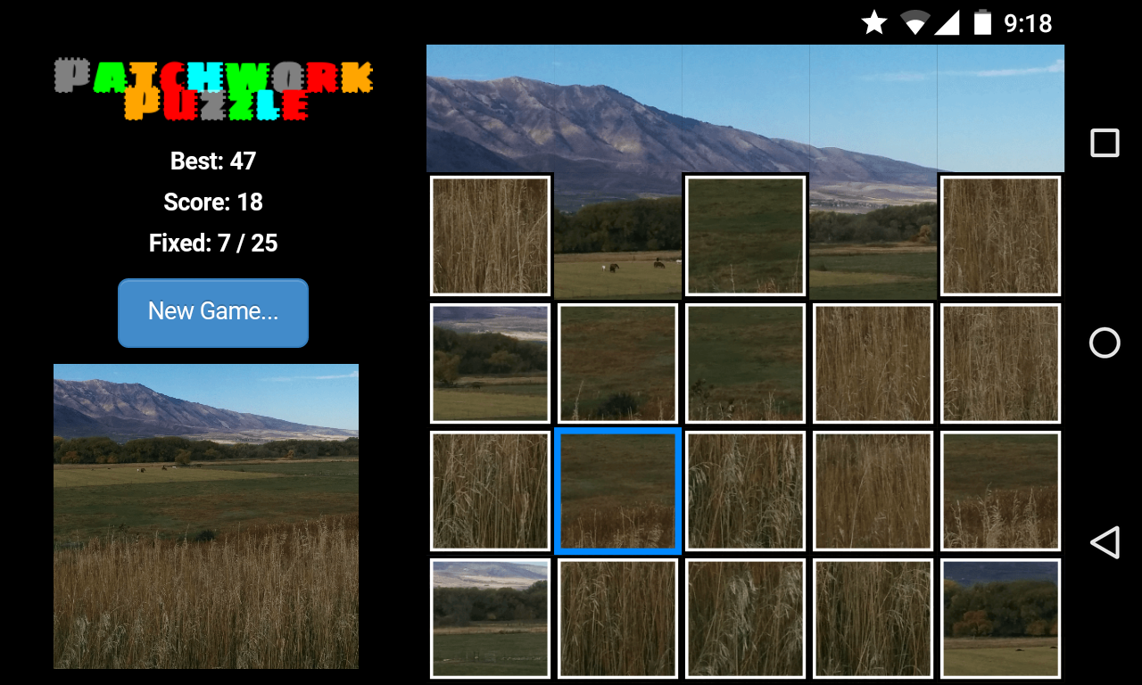 Patchwork Puzzle is a tile puzzle similar to a jigsaw puzzle but with square pieces. A picture is broken into squares that are then jumbled. Select two squares to switch their positions. Continue until the puzzle is solved.