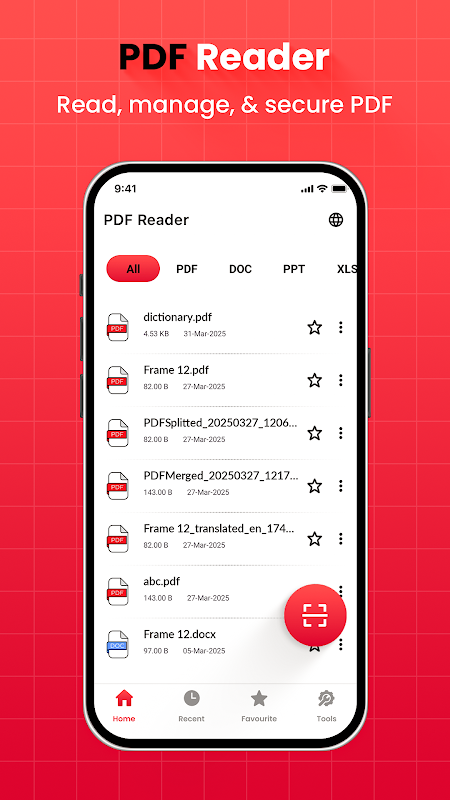 Grazie al visualizzatore PDF integrato, puoi aprire e navigare rapidamente tra i file PDF attraverso un'interfaccia pulita e moderna. Sfoglia i documenti, contrassegna i file importanti come preferiti, accedi istantaneamente ai file recenti e leggi i PDF in qualsiasi momento con facilità. Offre un'esperienza fluida e ottimizzata come visualizzatore PDF mobile, progettato per prestazioni e semplicità.